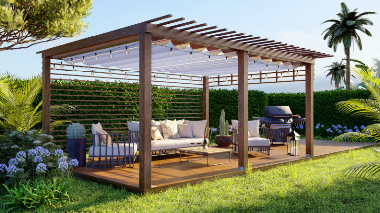 Un altro elemento fondamentale è il riparo. Ombrelloni, pergole o gazebo permettono di utilizzare lo spazio anche nelle ore più calde o in caso di pioggia leggera. Oltre alla funzione pratica, contribuiscono a definire visivamente l’area barbecue, rendendola più raccolta e piacevole.
